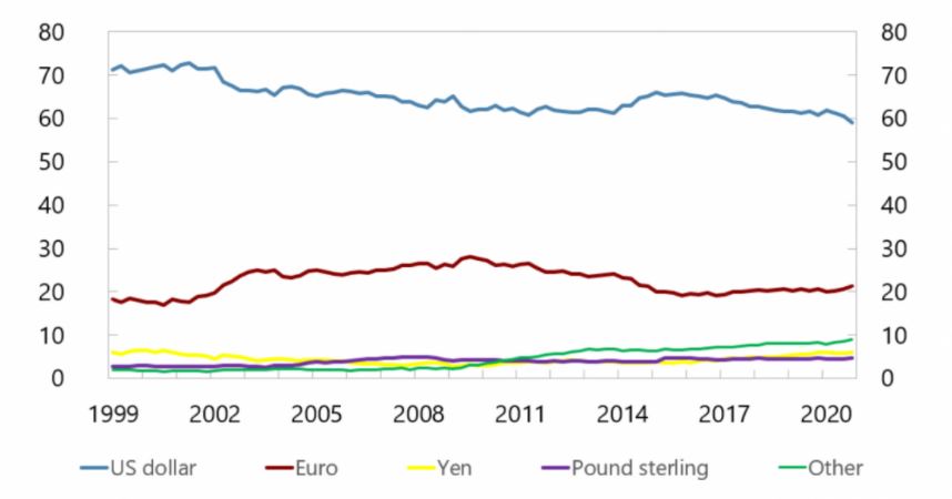 Vývoj podílu jednotlivých měn na rezervách centrálních bank od roku 1999