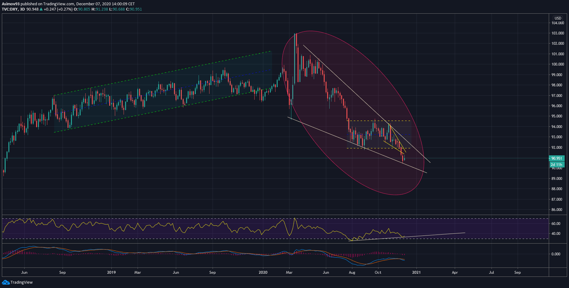 Index ztratil za relativně krátkou dobu přes 12 %, takže směnný kurz měny z několika příčin nesmírně trpí. Tou nejhlavnější je bezesporu politika Federální rezervní banky, která v březnu rozjela v podstatě neomezený quantitative easing. Lidově řečeno nezodpovědně “tiskne” peníze, čímž snižuje reálnou hodnotu dolaru.