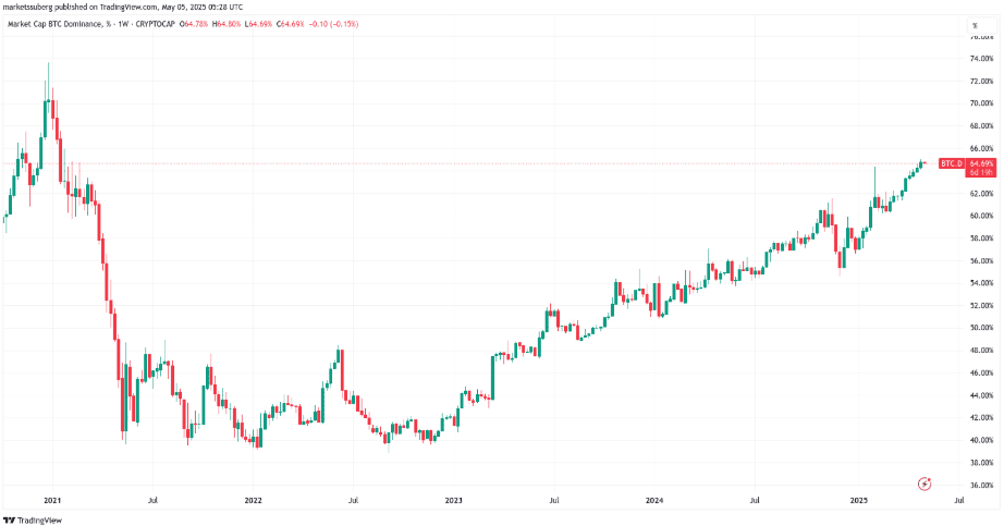 Na trhu s kryptoměnami dosáhla dominance Bitcoinu 65 %, což je nejvíce za poslední čtyři roky. Rostoucí dominance Bitcoinu signalizuje, že altcoiny jsou pod tlakem.