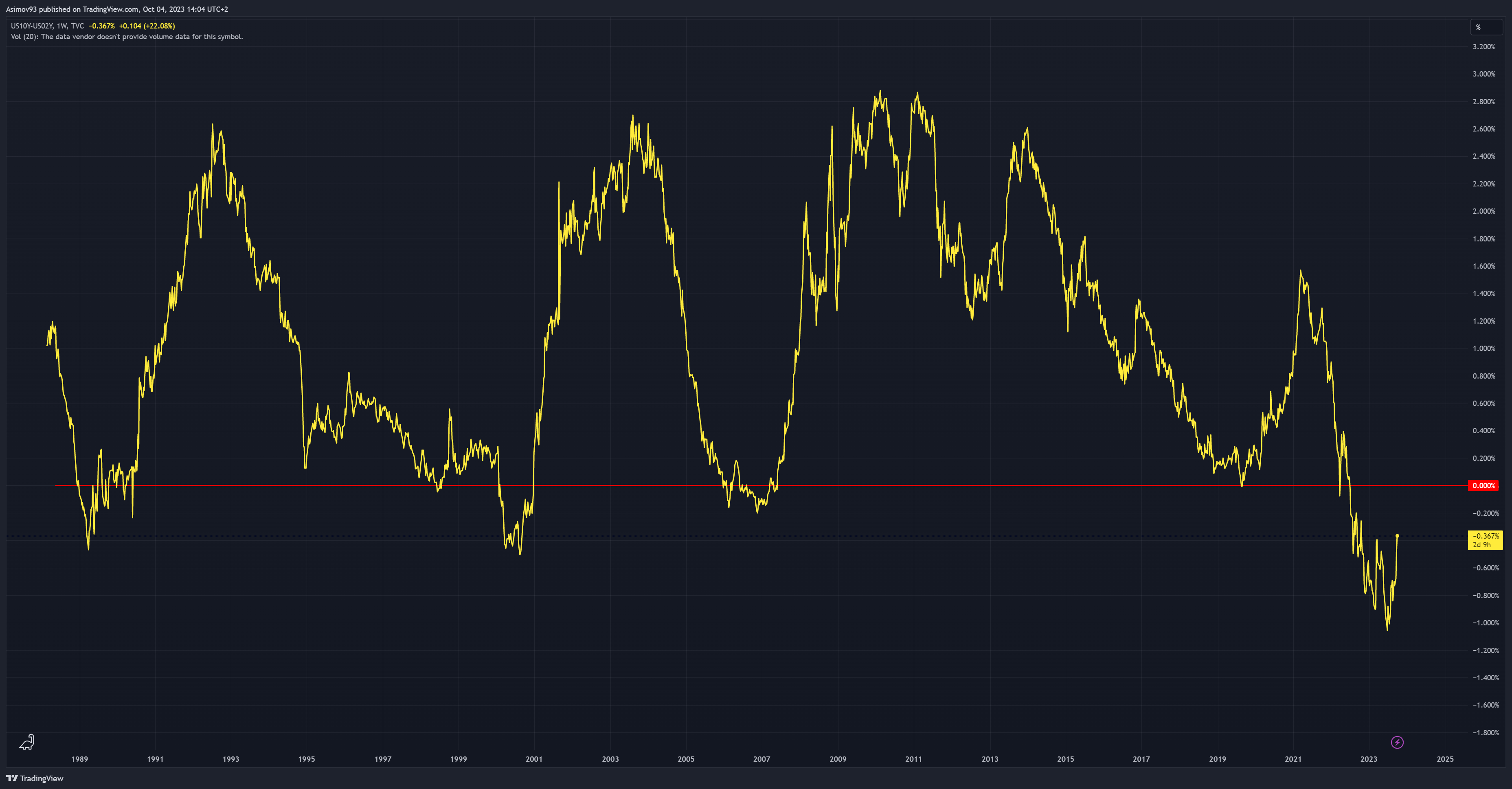 Záporná hodnota spreadu se začala rychle snižovat, díky poslednímu velkému růstu ve výnosech federálních dluhopisů s delší splatností. Ještě v červenci dosahovala hodnota -1,05 %. V těchto chvílích však spread činí -0,36 %. Co to znamená? Výnosová křivka se napřimuje, což je proces, ze kterého by měl mít každý investor dostatečný respekt. Proč? protože po samotném napřímení historicky docházelo k největším propadům na akciovém trhu. Nikoliv hned, s jistým zpožděním.