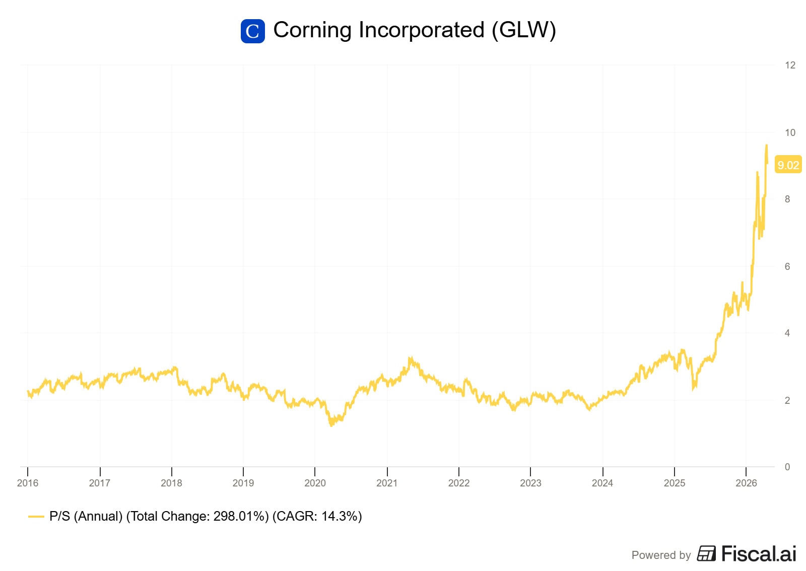 Cena akcií stoupla natolik rychle, že se Corning nyní obchoduje s výraznou prémií. To je ostatně dobře vidět na poměru P/S, který se nachází vysoko nad jeho dlouhodobými průměry.