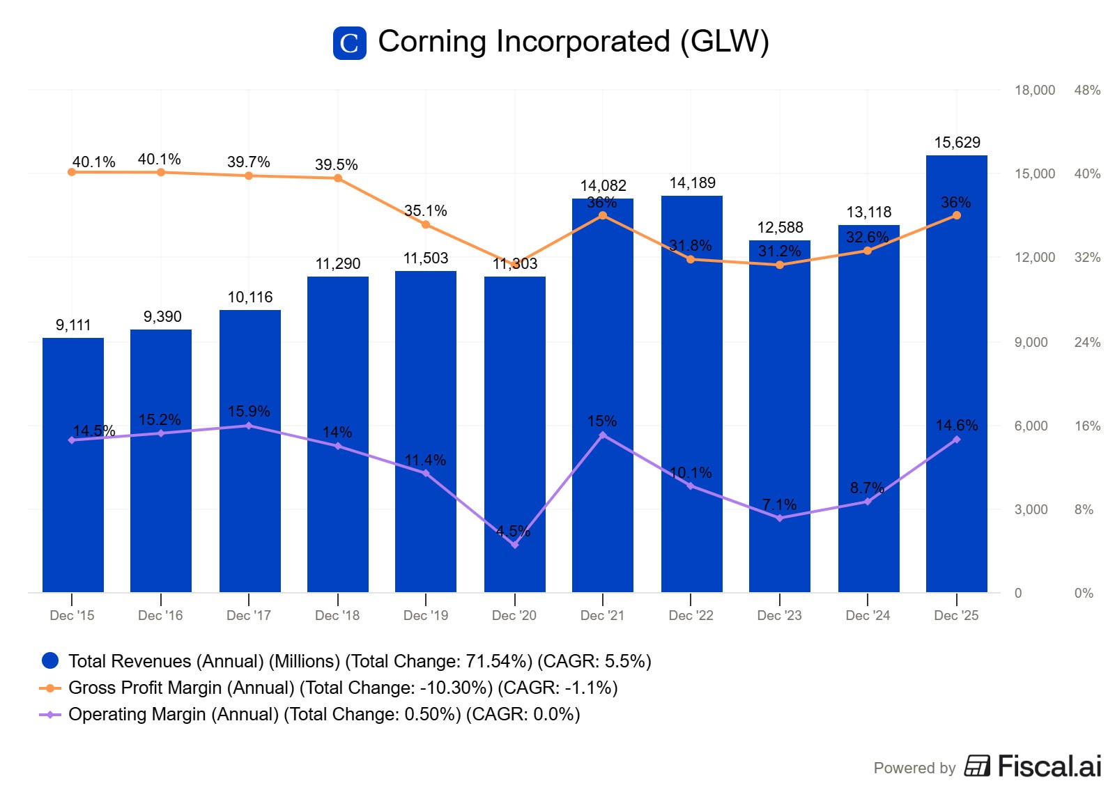 Na první pohled je zřejmé, že Corning v poslední dekádě stabilně rostl. Tržby se zvýšily zhruba z 9 miliard USD na více než 15,5 miliardy USD, což odpovídá solidnímu průměrnému ročnímu růstu (CAGR) kolem 5,5 %.