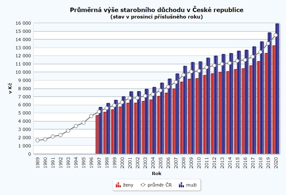Průměrná výše důchodů v roce 2020 dosáhla u mužů téměř 16 000 Kč. Důchody žen v průměru překonaly hranici 13 000 Kč