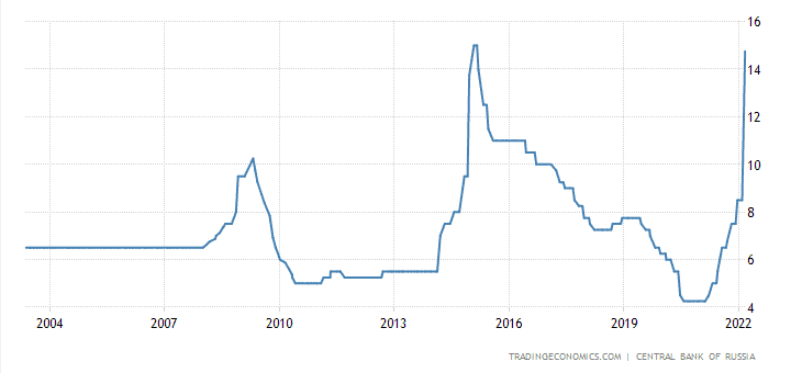 Když Centrální banka Ruské federace zvedla základní úrokové sazby z 9,5 % na 20 %, bylo hned zřejmé, že se tamní měnová autorita snaží za jakoukoliv cenu bránit proti negativním důsledkům vzešlých z ekonomických sankcí. Rusové si vysoké úrokové sazby mohou dovolit, protože jejich veřejné finance jsou v pořádku. Respektive v kontrastu se západními zeměmi mají velmi nízký veřejný dluh – čili by neměl být problém i další markantní navýšení. Nicméně je nyní jisté, že Rusko skáče do těžké recese.