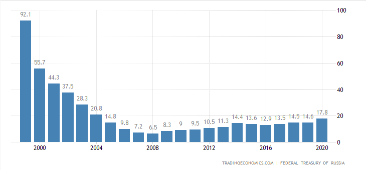 Mnoho západních států by si podobné zvýšení základních úrokových sazeb nemohlo dovolit. Ale Rusko má veřejné finance v kontrastu se západními zeměmi téměř v naprostém pořádku. Respektive veřejný dluh se dlouhodobě drží na nízkých úrovních. Proto si mohla Ruská centrální banka tento krok dovolit. Když by byla Ruská federace stejně zadlužená jako před rokem 2000, měnová autorita by nemohla vůbec nic dělat.