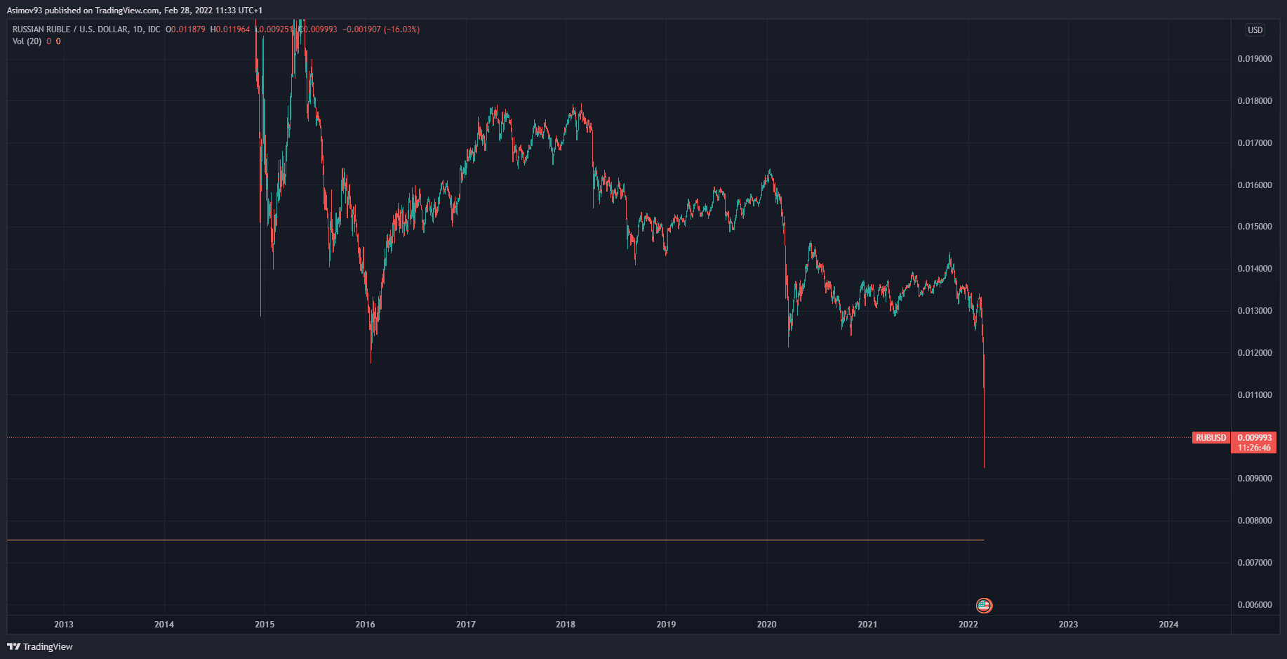 Ještě se hodí zmínit poslední propad rublu vůči americkému dolaru. Za pouhých pár minut se jeho hodnota propadla o více jak 20 %. Rubl se tak dostal na svá historická minima a nejspíš nějakou dobu zůstane dole, přestože se část ztrát povedlo umazat.