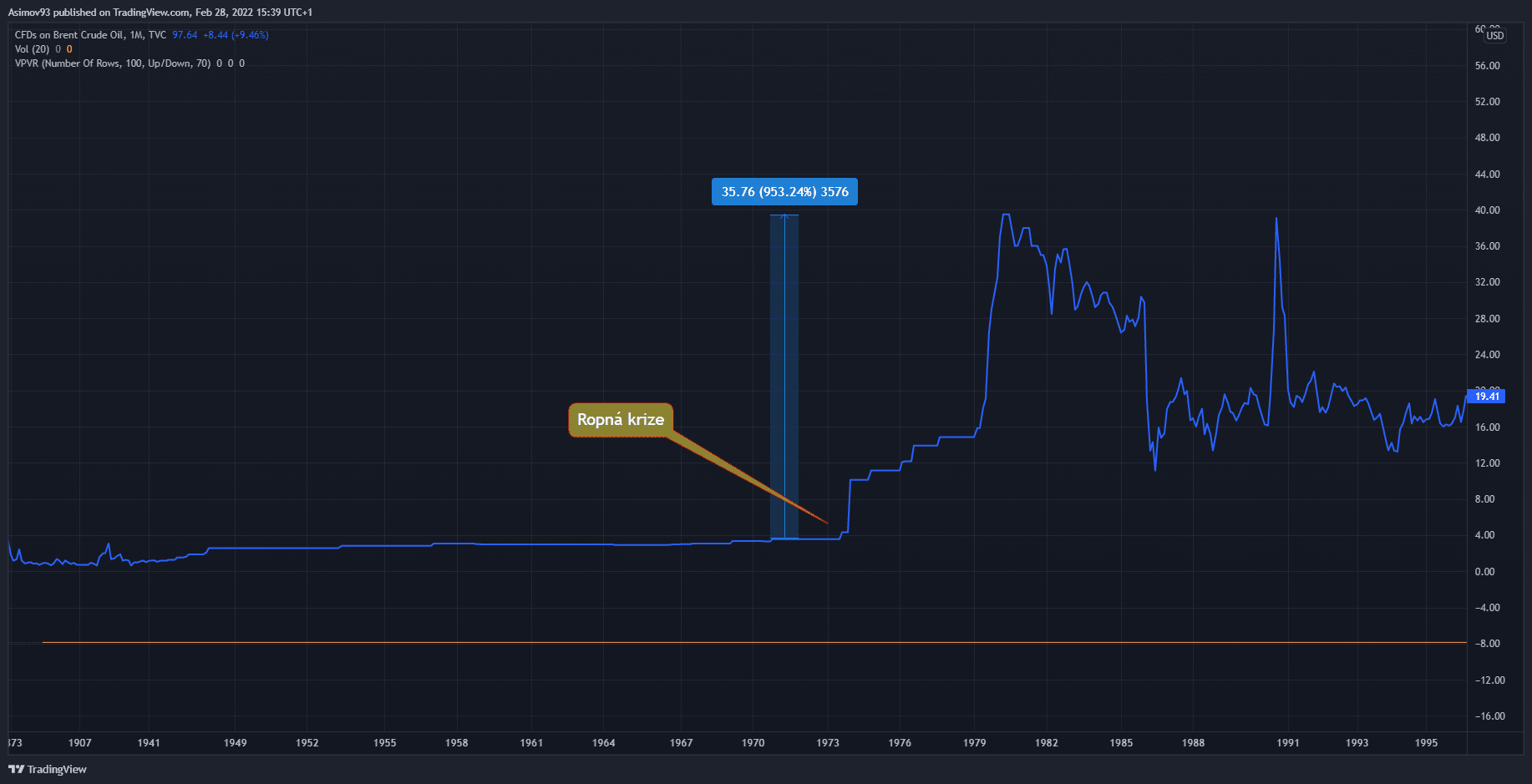 Pro představu přikládám graf ze 70. let, kdy byla v plném proudu tzv. ropná krize. Tehdy ropa Brent během několika let stoupla na ceně zhruba o 950 %. Neříkám, že se musí stát úplně to stejné, když vypadnou dodávky ropy z Ruska. Může se stát ale něco podobného.