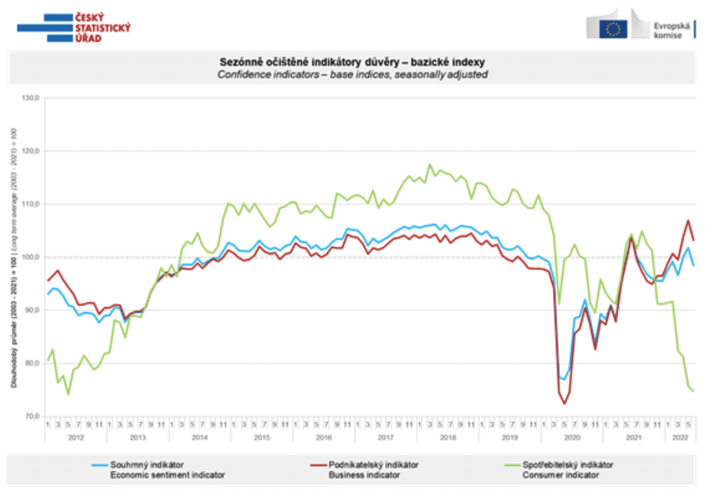 Na grafu níže můžeme vidět modrou barvou vývoj celkového indikátoru důvěry. Jedná se o indikátor ekonomického sentimentu, který poklesl o 3,5 bodu na hodnotu 98,3, jelikož poklesl indikátor podnikatelů i spotřebitelů.