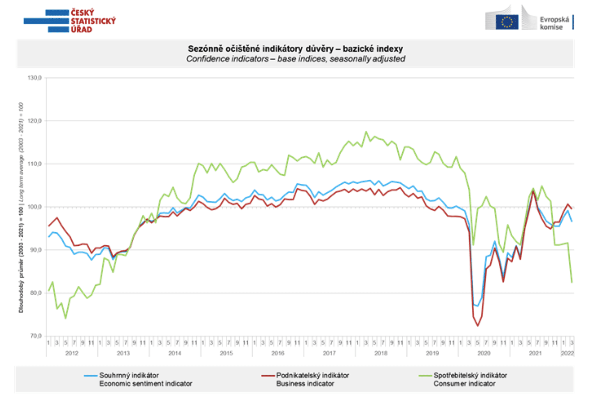 Český statistický úřad (ČSÚ) uvedl, že březnová důvěra spotřebitelů byla nejnižší za posledních více než 9 let. Důvěra v českou ekonomiku meziměsíčně klesla o 2,6 bodu na 96,6 bodu. Proti únoru se propadla o 9,3 bodu na 82,4 bodu. Důvěra podnikatelů klesla o 1,2 bodu na 99,5 bodu. Ovšem při porovnání s březnem 2021 je souhrnný indikátor důvěry vyšší u podnikatelů.