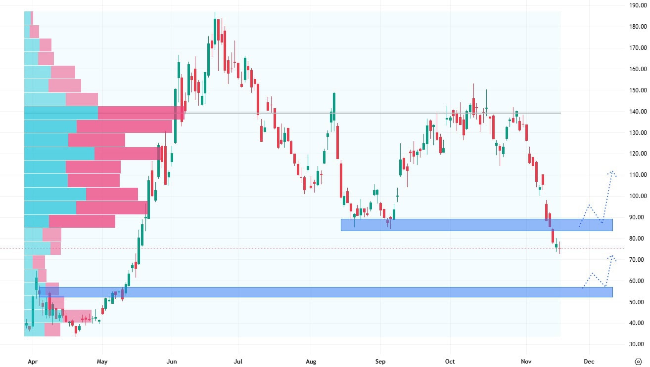 Akcie CoreWeave se obchodují v klesajícím trendu s tím, že výrazně ustoupily ze svých maxim. Aktuálně dokonce prorazily hodnotu cenového low, které tak tvoří nejbližší rezistenci.