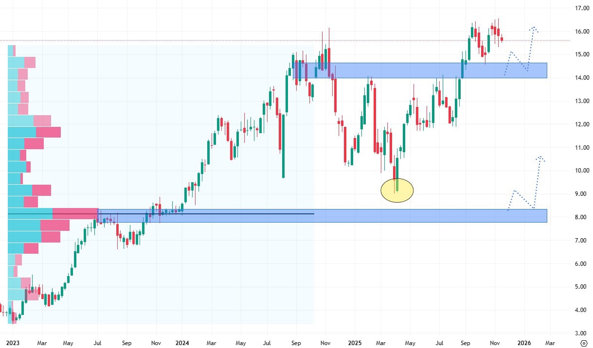 Akcie Nu Holdings se obchodují v rostoucím trendu a aktuálně na svých cenových maximech. Akce drží na vyšších hodnotách support na ceně 14 USD. Jeho případným proražením by se ovšem akcie mohly dostat do down trendu.