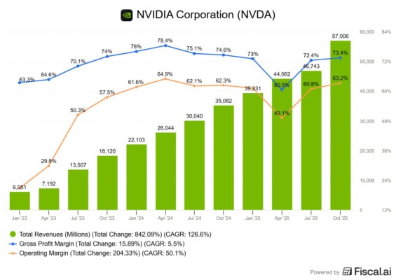 Boom AI znamenal pro společnost rekordní tržby i v Q3 2026, které skončilo v říjnu. Nvidia vykázala meziroční růst tržeb o 62 % na 57 miliard USD. Největší podíl na tom měly tržby segmentu datových center 51,2 miliardy USD (+66 %).