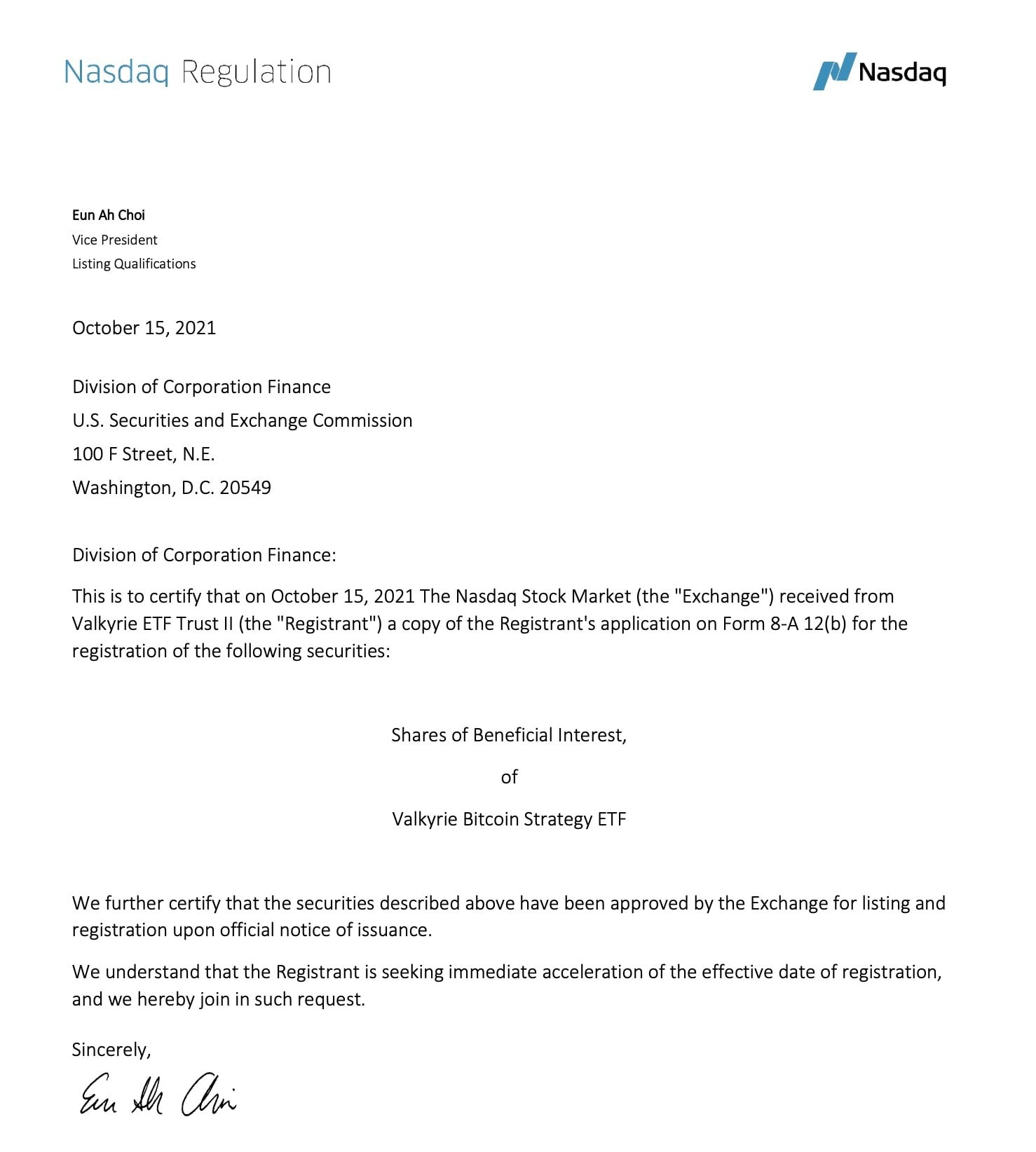 Hlavní rozdíl mezi fondem ProShares a tímto je burza, na které jsou obchodovány. ETF od společností Valkyrie je kótované na burze Nasdaq pod tickerem $BTF. V dopise viceprezidenta Nasdaq z 15. října burza uvedla, že ETF akcie Valkyrie byly certifikovány.