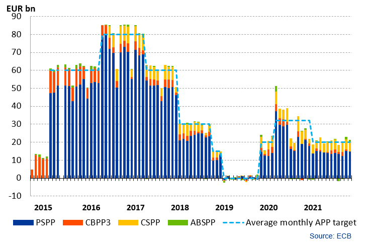 ECB začala speciálně kvůli pandemii s programem kvantitativního uvolňování (QE), s tzv. PEEP (Pandemic Emergency Purchase Programme). Celkový objem těchto nákupů měl být 1,85 bilionu eur. V souvislosti s vyšší inflací bylo rozhodnuto, že těch 1,85 bilionů nebude dosaženo a celé PEPP skončí již v březnu roku 2022. Uvedený program je v provozu od března 2020, takže ECB měsíčně nakupovala aktiva za zhruba 77 miliard eur.