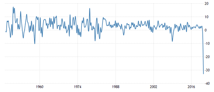Jedná se o příšerný výsledek, ale přesto je zde alespoň malinké pozitivum – tento výsledek je o něco lepší, než očekávali analytici. Ti v průměru očekávali 34 %. Každopádně se jedná o nejhlubší propad od roku 1947 – to se začalo HDP měřit dle aktuálně používané metriky (viz graf níže). Dřívější data nejsou dobře srovnatelná.