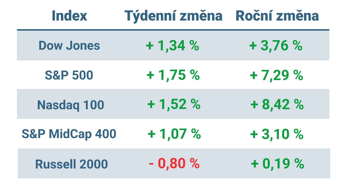 Tabulka ukazuje vývoj nejvýznamnějších amerických indexů v tomto týdnu a v roce 2024