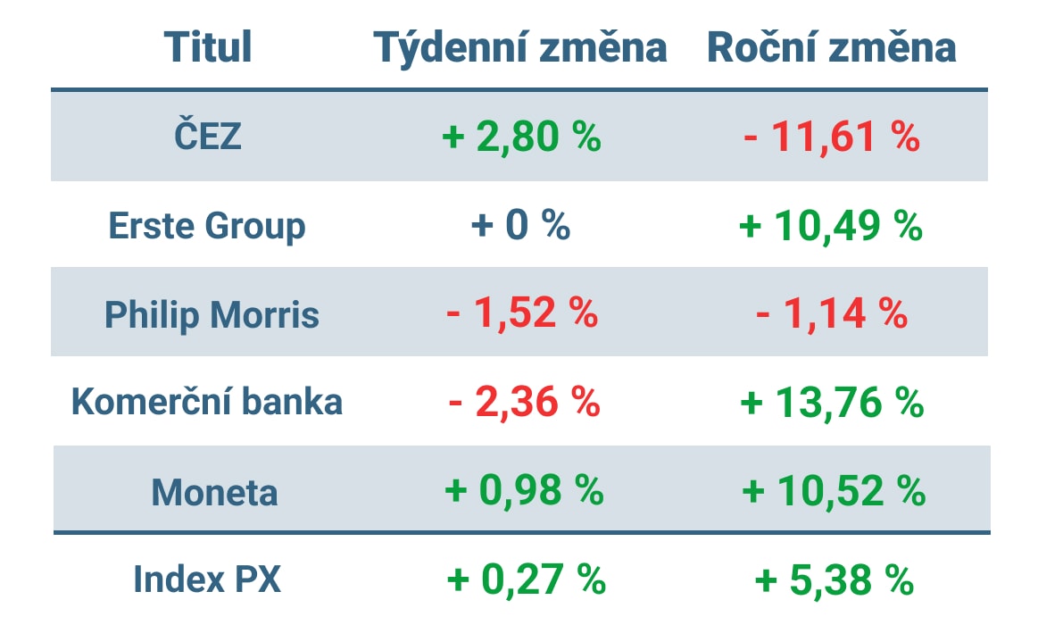 Naopak přibližně 1,5 % odepsaly akcie Philip Morris a přes 2 % ztratil dosavadní lídr letošního obchodování na pražské burze, a to akcie Komerční banky. Akcie Erste Group se v týdnu obchodovaly nakonec beze změny.
