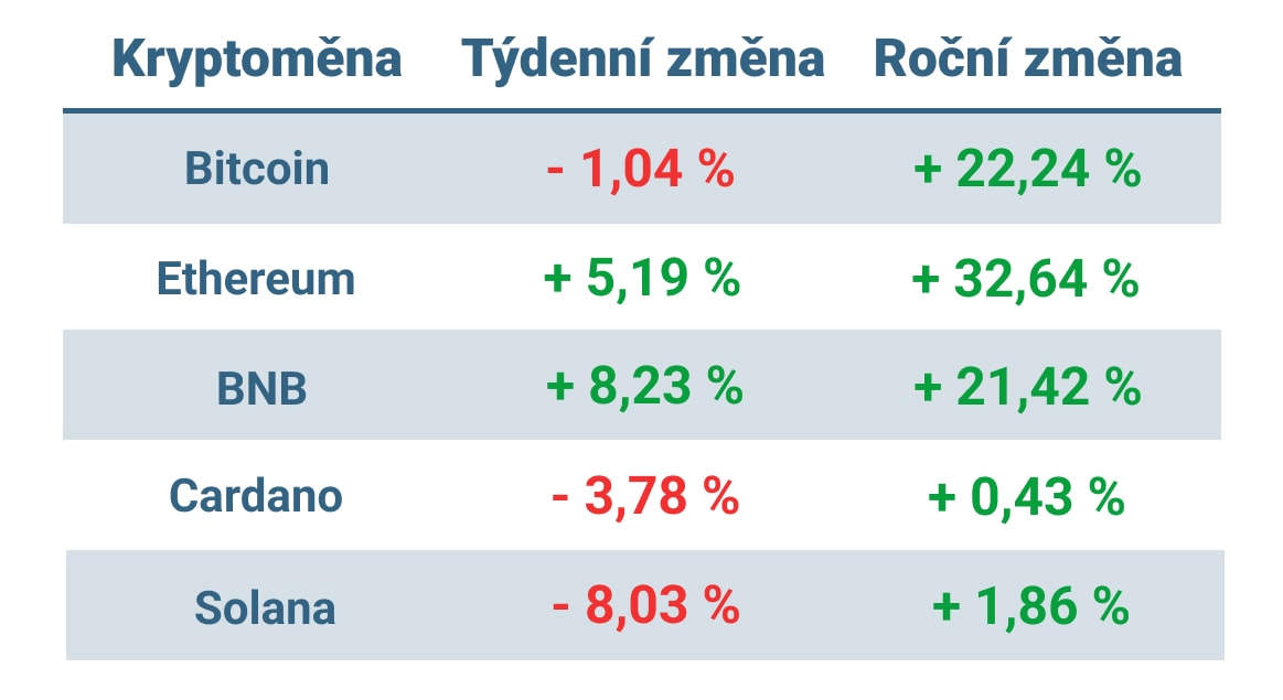 Vývoj ceny nejvýznamnějších kryptoměn za posledních 7 dní a v roce 2024