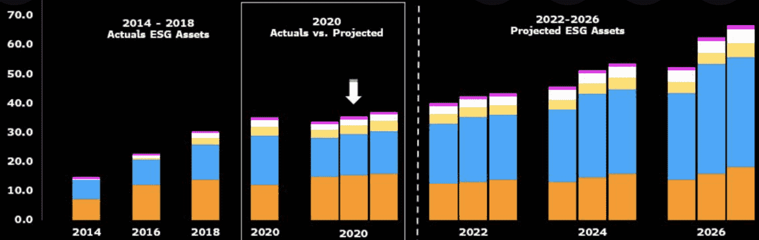 Na grafu výše jsme mohli vidět, že dle predikcí bude pokračovat rostoucí příliv peněz do ESG i v následujících letech.