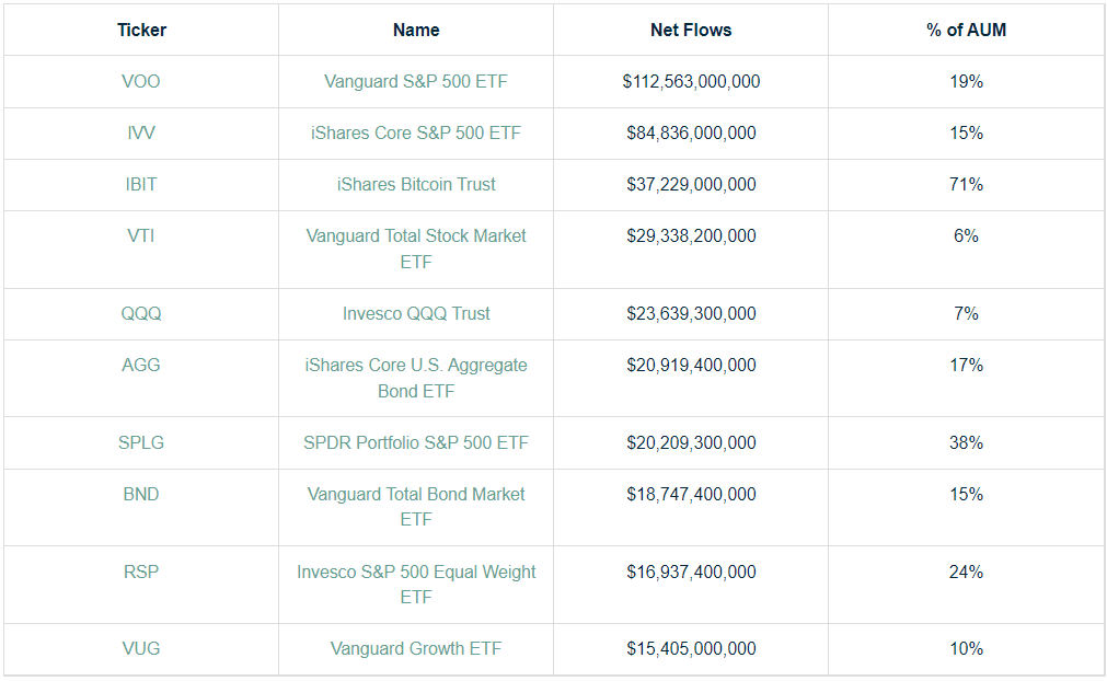 Jediné fondy, které během roku získaly od investorů více kapitálu jsou iShares Core S&P 500 ETF (IVV) a Vanguard S&P 500 ETF (VOO), které zaznamenaly příliv téměř 85 miliard dolarů a 113 miliard dolarů.