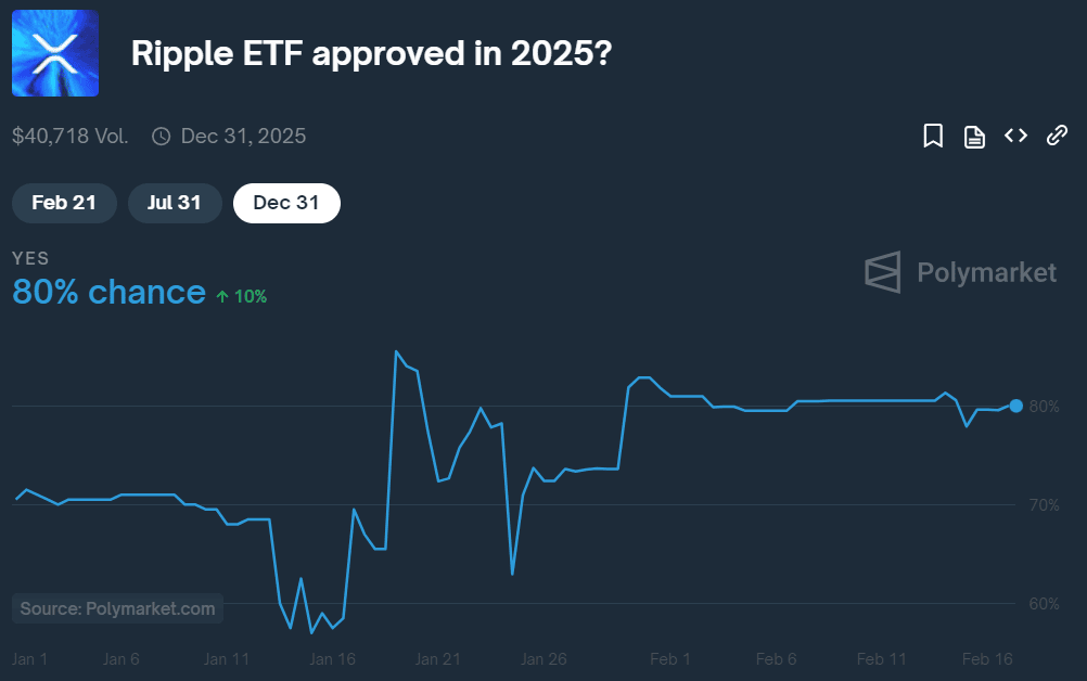 Mezi investory do kryptoměny XRP panuje optimismus, neboť se pravděpodobnost schválení burzovně obchodovaného fondu (ETF) na XRP v roce 2025 zvýšila. Nově se v rámci predikčního trhu Polymarket vyšplhala až na 80 %.