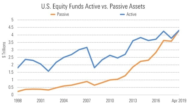 O tom, že se jedná o velmi populární cestu investování hovoří i fakt, že množství pasivně investovaných peněz v USA předstihl objem aktivně investovaných. Jak můžete vidět na grafu níže.