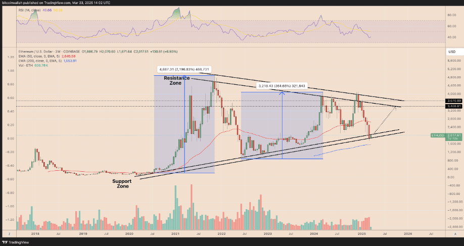 Podle predikcí by Ethereum mohlo do června vzrůst na 3 400 dolarů, což představuje 65% nárůst oproti současné ceně. Tato úroveň totiž odpovídá klesajícímu rezistentnímu kanálu na kryptoměně.