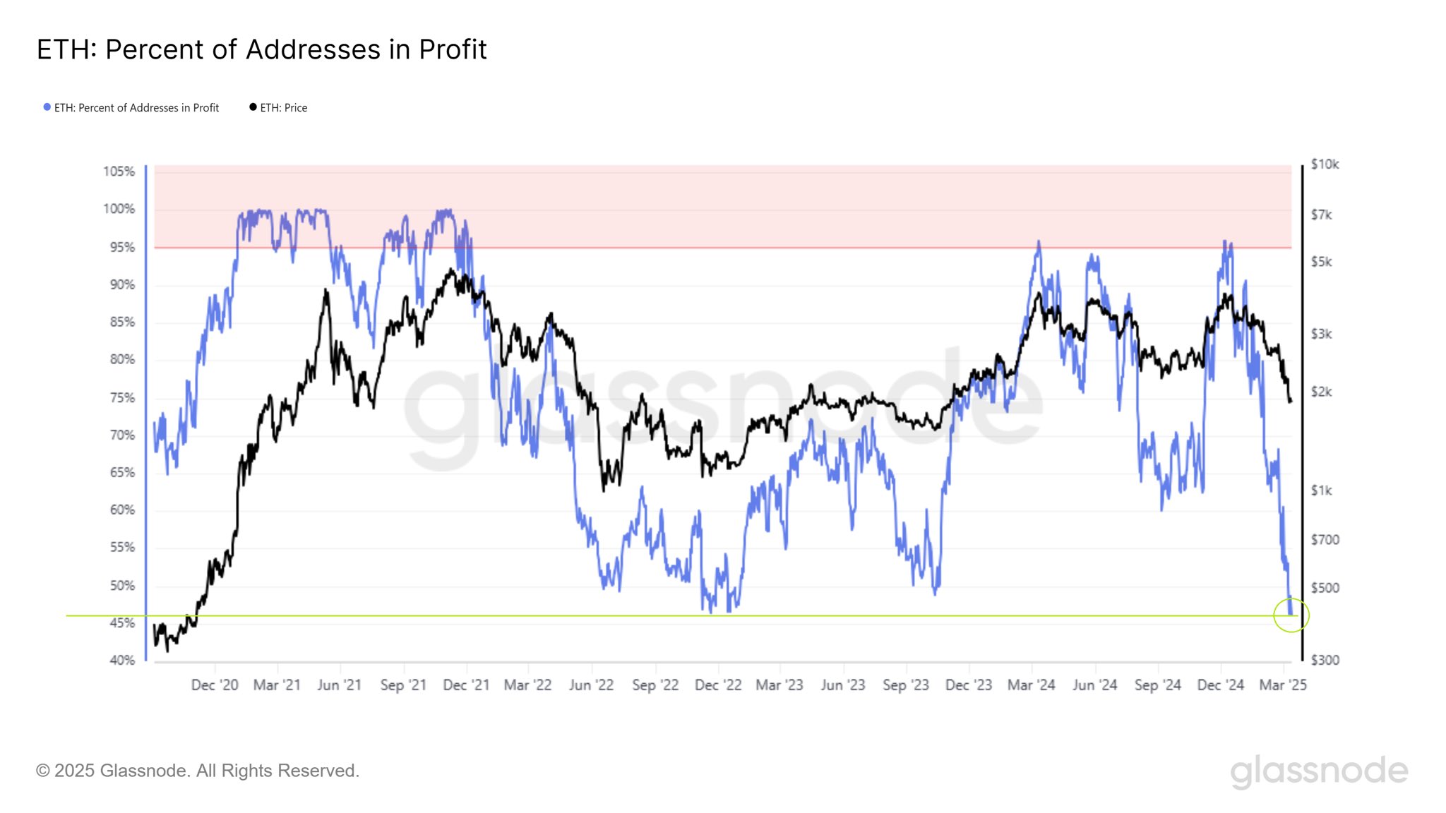 Procento adres, které drží Ethereum a jsou v zisku, kleslo na nejnižší hodnotu od prosince 2022, a to na necelých 46 %. Historicky takto nízké úrovně zisku často signalizují cenové dno pro Ethereum.