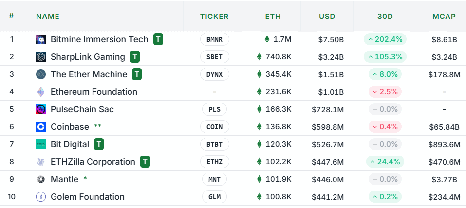Jen samotná společnost Bitmine Immersion Tech, jež momentálně vlastní nejvíce ETH ze všech korporací, veřejně deklarovala, že chce vlastnit až 5 % nabídky ETH.