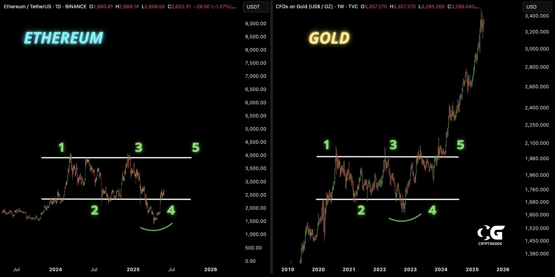 Za posledních 30 dnů Ethereum posílilo o 30 % a aktuálně se obchoduje kolem úrovně 2 500 dolarů. Analytici navíc diskutují, že by mohlo napodobit cenový vývoj zlata, neboť má graf Etherea podobnou strukturu.