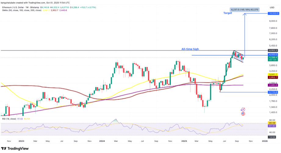 Ten se vyplní v případě, když cena Etherea překročí horní trendovou linii a vzroste na úroveň předchozího růstového trendu. Kryptoměna by tak mohla posílit na 10 533 dolarů, což představuje 145% nárůst ze současné ceny.