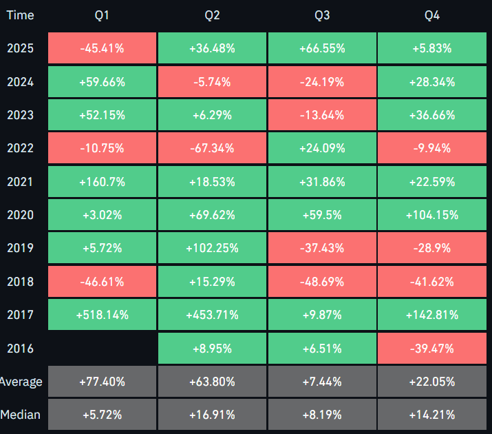 Podobně i Ethereum včera zaznamenalo 5% zisk a opět se obchoduje kolem úrovně 4 400 dolarů. Pro tuto kryptoměnu je naopak historicky nejúspěšnější z hlediska průměrného cenového vývoje první kvartál s 77% výnosem.