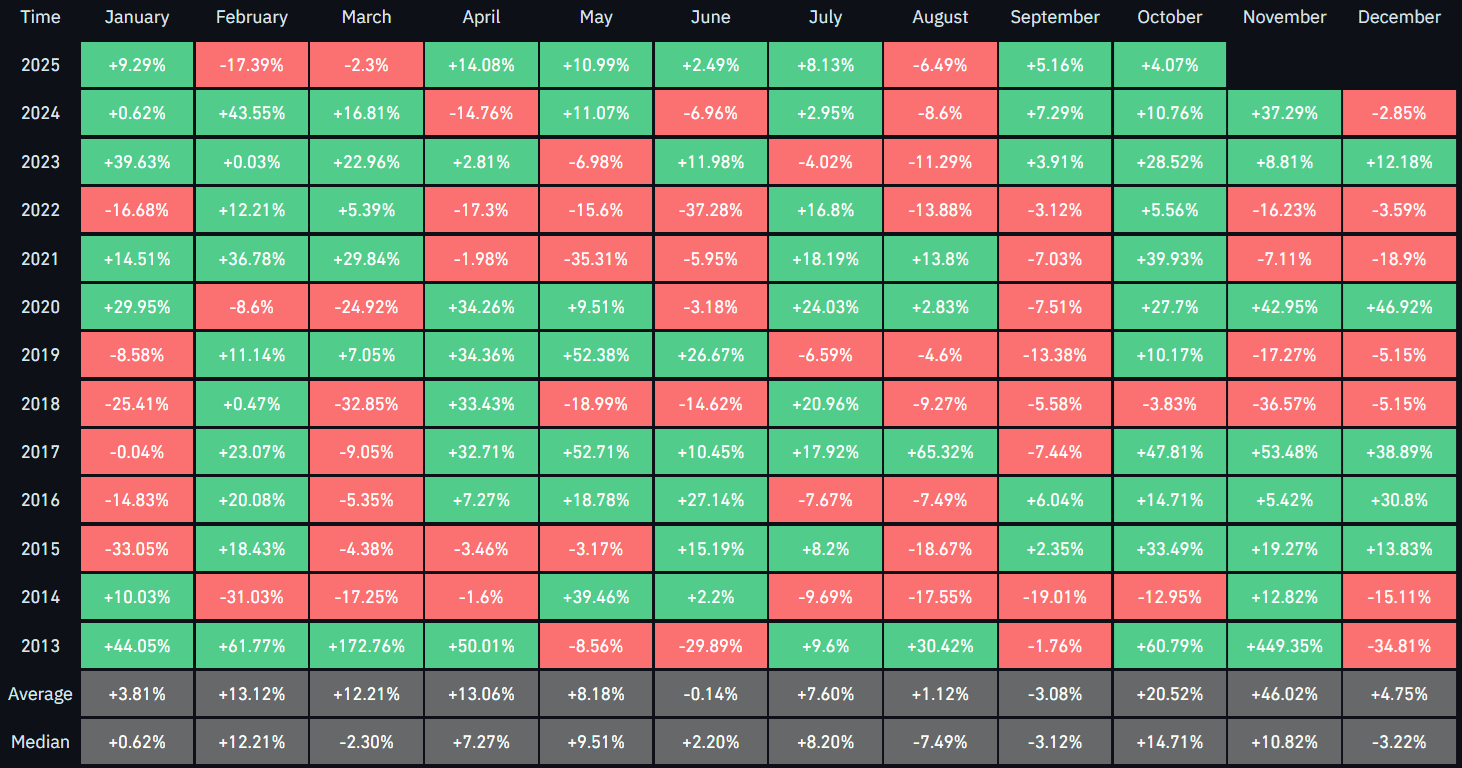 V tento měsíc průměrně posiluje o 20,5 %, zatímco listopad je ještě lepší s průměrným ziskem ve výši 46 %. Pozoruhodné je, že je celkově poslední kvartál roku pro Bitcoin cenově nejpřívětivější s průměrným výnosem ve výši 79 %.