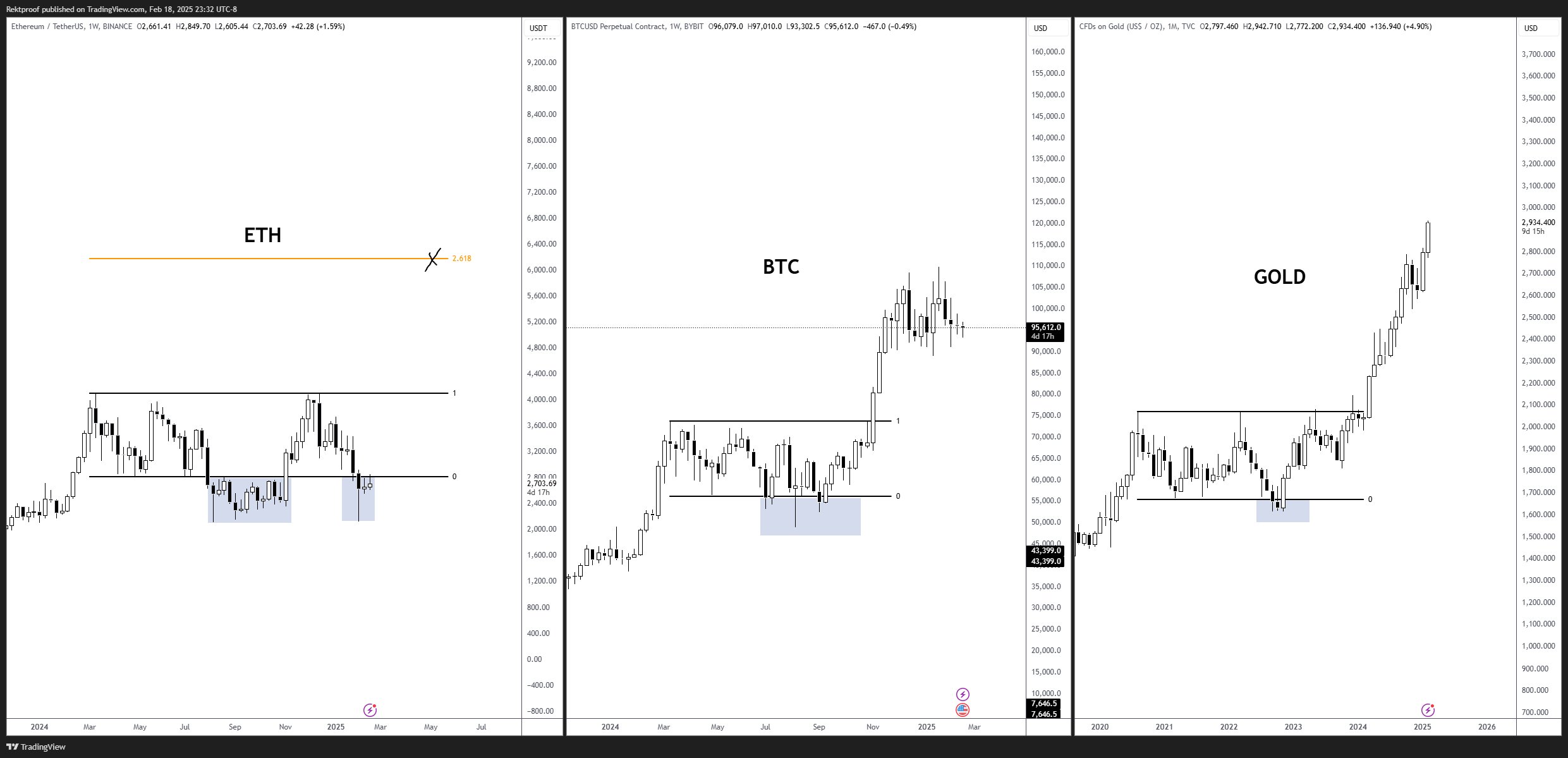 S výhledem souhlasí i další trader, Rektproof, který vidí v současné ceně Etherea potenciál. Přirovnává jeho vývoj k Bitcoinu a zlatu, přičemž si všímá jeho zaostávající výkonnosti oproti těmto aktivům.