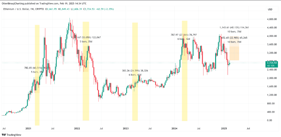 Od roku 2020 Ethereum historicky rostlo ve druhé polovině prvního čtvrtletí. Swing trader s přezdívkou Honey, poznamenává, že historická data naznačují možnost opakování tohoto trendu i v roce 2025.