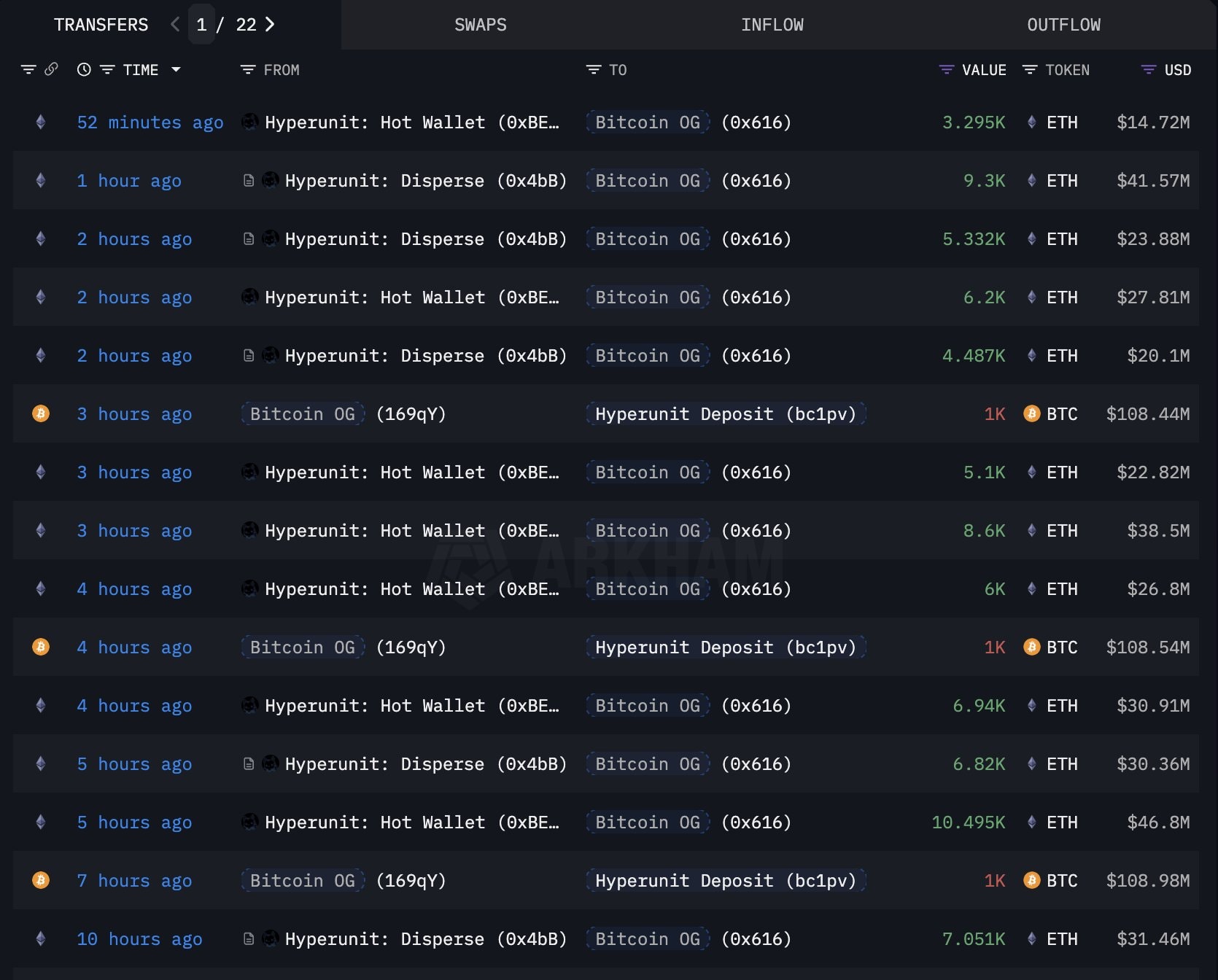 V jednom 12hodinovém okně tato velryba prodala 4 000 BTC za zhruba 435 milionů dolarů a obratem nakoupila 96 859 ETH na spotu. Dnes ráno vložila dalších 1 000 BTC na decentralizovanou burzu Hyperliquid.