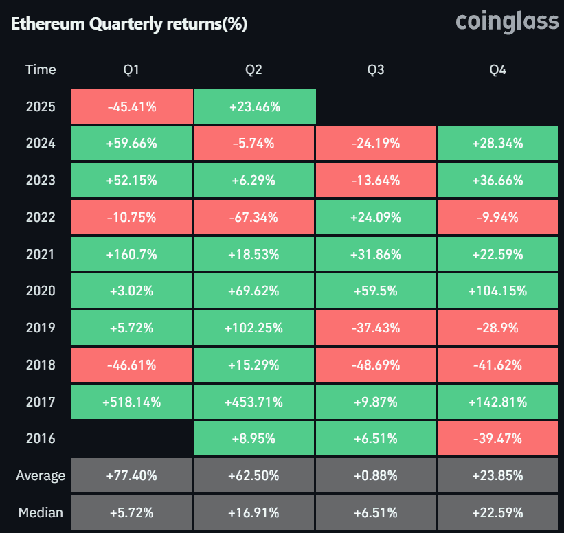 Z historického hlediska dosahuje Ethereum ve druhém kvartálu od roku 2013 průměrného výnosu 62,5 %. Pokud se bude historie opakovat, mohla by jeho cena dosáhnout do konce června až 2 950 dolarů.