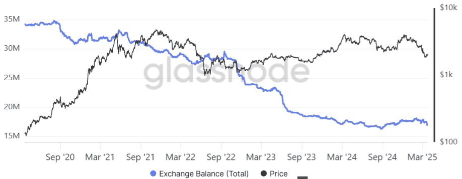 Podle dat Glassnode činila nabídka Etherea na burzách k úterý 16,9 milionu ETH, což je jen 3,5 % nad pětiletým minimem 16,32 milionu ETH.