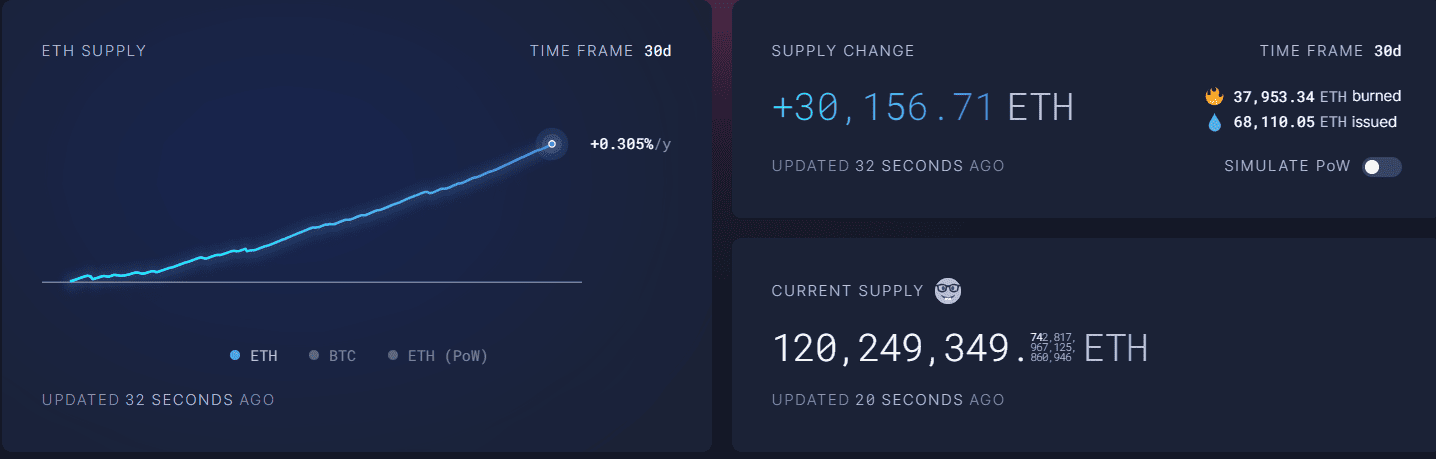 Od začátku roku 2023 zaznamenává Ethereum (ETH), druhá největší kryptoměna na světě, zvýšenou míru inflace celkové zásoby ETH. Podle statistik webu Ultrasound Money se jen za posledních 30 dní celosvětová nabídka ETH zvýšila o více než 30 000 ETH, což při aktuálních cenách odpovídá zhruba 1,1 miliardě Kč.