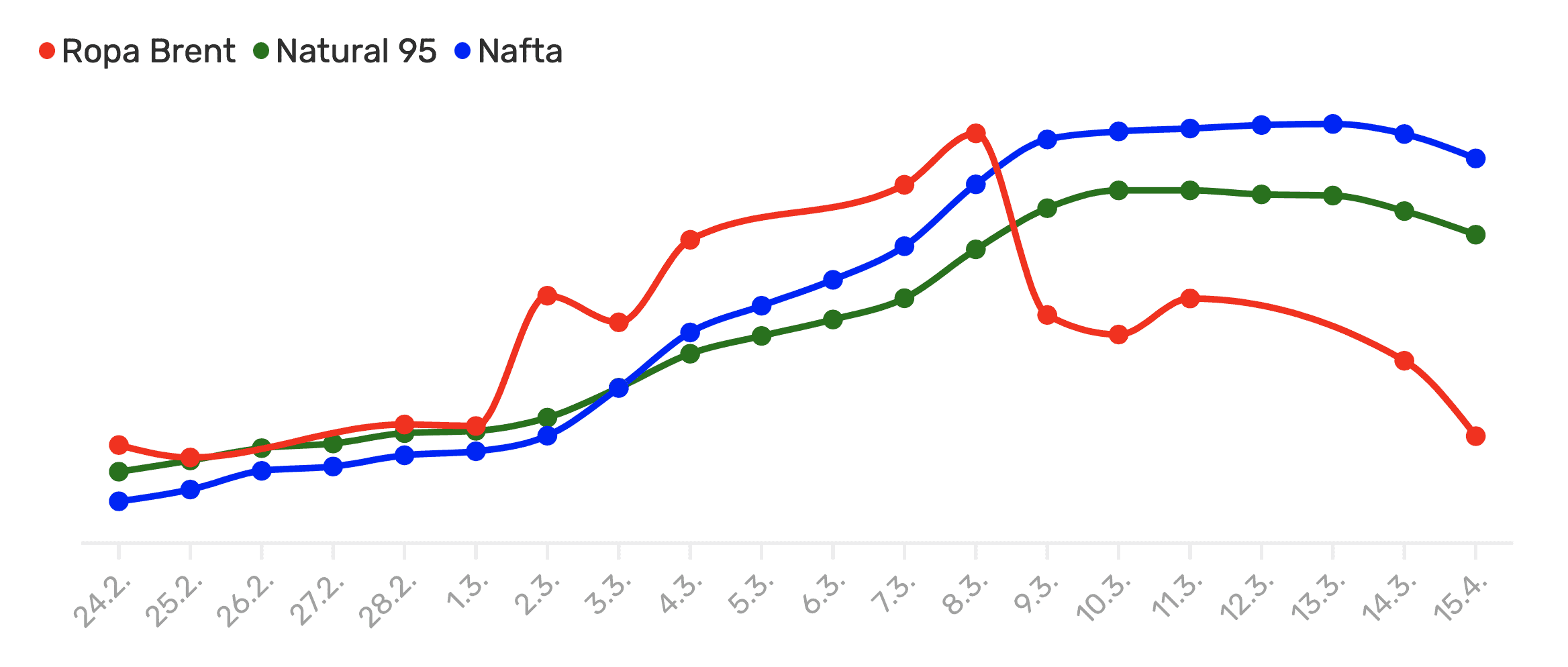 Pokud se podíváme na aktuální data, tak ceny pohonných hmot v Česku dál znatelně klesají. Litr Naturalu 95 zlevnil v úterý 15. 3. v mezidenním srovnání o 82 haléřů na průměrných 45,72 Kč, cena nafty spadla dokonce o 85 haléřů na průměrných 48,37 Kč. V porovnání s poklesem ceny středomořské ropy Brent je ale tempo zlevňování benzinu a nafty v Česku pomalé jak můžete vidět na grafu níže.