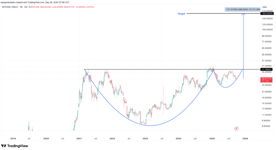 Tapiero argumentuje vývojem obchodního páru BTC/XAU, který na týdenním grafu vytvořil vzorec cup and handle. Uvádí, že pokud dojde k překonání úrovně 37, otevírá se Bitcoinu cesta posílit vůči zlatu o dalších 446 % na úroveň 160.