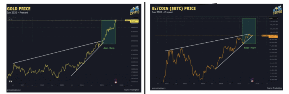 Účet na sociální síti X, Milk Road Macro, uvedl, že dané proražení klínu přineslo zlatu asi 10 %, přičemž Bitcoin má průrazy 5x až 10x silnější.