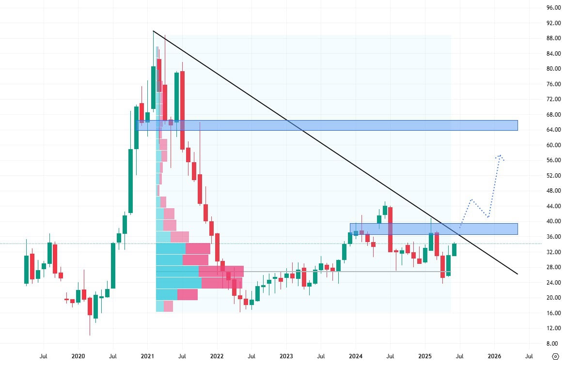 Akcie Pinterest se obchodují v postranním trendu a to od roku 2022. V tomto roce si akcie prošly výrazným cenovým propadem a v současné době se z něj stále vzpamatovávají.