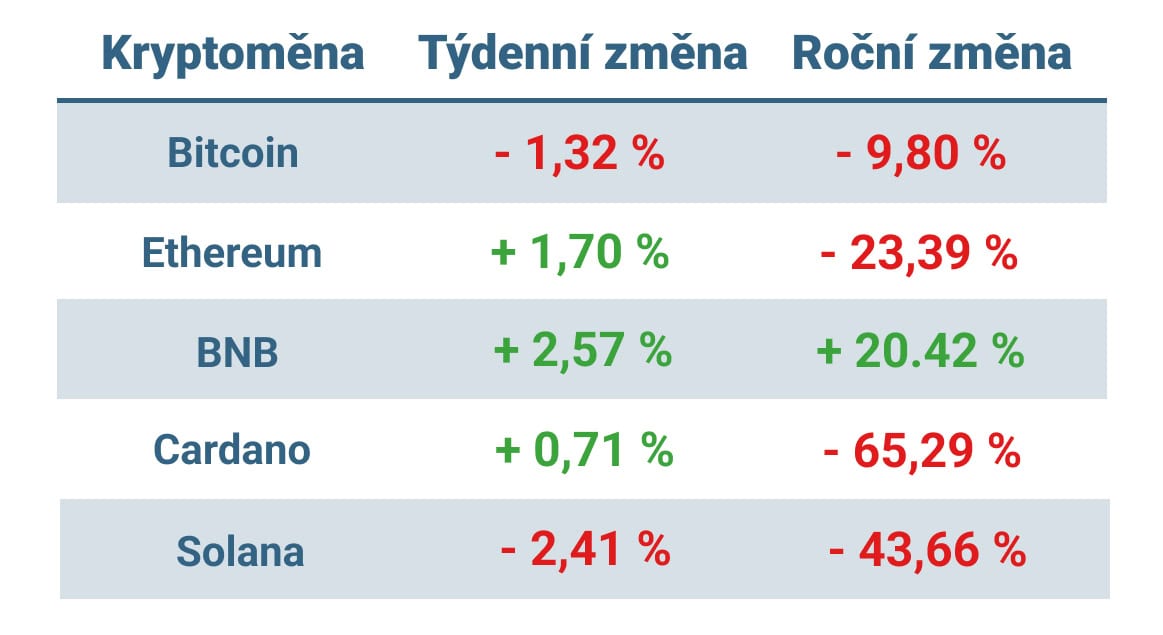 Solana pak odepsala za týden 2,4 % a v meziročním srovnání ztrácí přes 40 %.