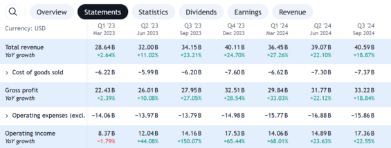 To představovalo 152,5 miliardy dolarů z celkových 154 miliard dolarů za období posledních 12 měsíců ke třetímu čtvrtletí roku 2024.