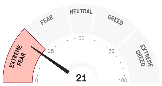 Jedním z nejznámějších indikátorů tržního sentimentu je Fear and Greed index, který je vypočítáván na základě sedmi indikátorů. Tento index měří pomocí technických ukazatelů různé tržní veličiny, podle kterých vyvozuje chování investorů, které odpovídá buď emocím strachu nebo chamtivosti. Právě tento indikátor nyní signalizuje extrémní strach, což je hodnota, která se zas tak často nevidí.