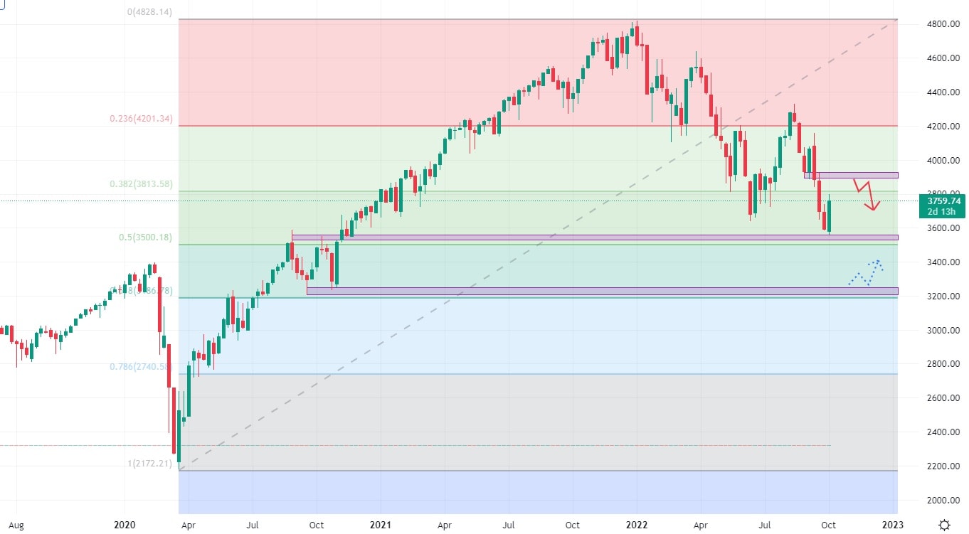 Akciový index S&P 500 se pohybuje ve vlnách, ovšem v jasně klesajícím trendu. V současné době se index obchoduje na supportní zóně, kde proběhla nákupní aktivita. Cesta vzhůru je ovšem lemována rezistentní zónou, která se nachází na low menší cenové konsolidace na psychologické hranici 4.000 bodů.