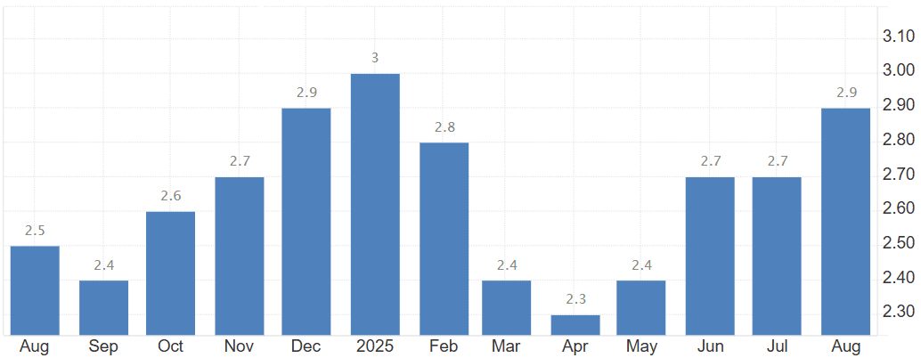 Naproti tomu inflace akceleruje a v srpnu vzrostla na 2,9 %, zatímco inflační cíl americké centrální banky činí 2 %.