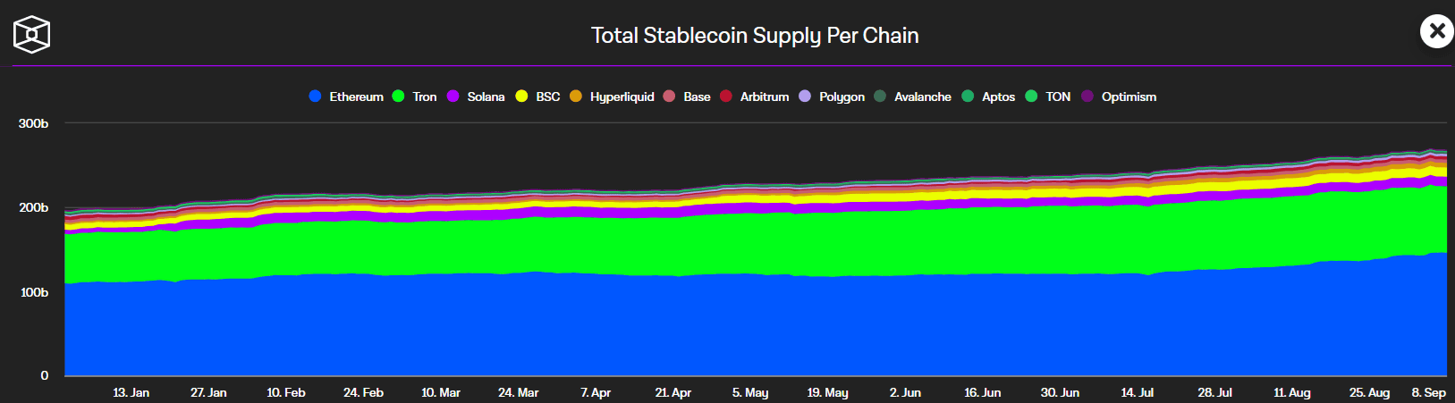 V oběhu jsou nyní stablecoiny v hodnotě 290 miliard dolarů, přičemž od začátku roku narostla tržní kapitalizace tohoto segmentu o téměř 50 %. Nejvíce stablecoinů je na síti Etherea a poté na Tronu.