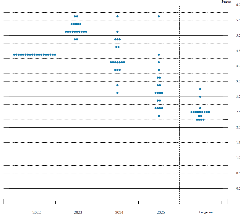 Mou tezi potvrzuje i Dot Plot, což je diagram, který vizualizuje výhled jednotlivých členů FOMC, co se týče výše úrokových sazeb. Z něj vyplývá, že nejvíce členů vidí vrchol v příštím roce na úrovních 5,25 – 5,5 %. Nejde ale o nic závazného. Je to pouze odhad, který se může změnit v návaznosti na makroekonomický vývoj. Je třeba ale skutečně počítat s tím, že na konec restrikcí si ještě počkáme.